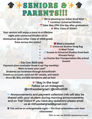 Monterey Trail High School supports safe and sober graduation activities. However, “Safe and Sober Grad Night” is a parent organized and parent led event. It is not sponsored by Monterey Trail High School or the Elk Grove Unified School District. Participants will be graduates of the school by the time they participate in “Safe and Sober Grad Night” and will no longer be the responsibility of the school district. The school or the school district can’t be held responsible for the safety and security of this event.